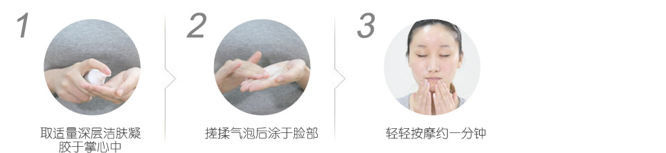 取適量深層潔膚凝膠于掌心中,搓揉起泡后涂于臉部(但要避開眼睛部位),并輕輕按摩約一分鐘,再以清水洗凈。建議晚間適用。